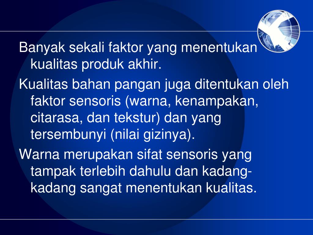 Banyaksekalifaktor yang menentukankualitasprodukakhir. Kualitas bahan pangan juga ditentukan oleh faktor sensoris (warna, kenampakan, citarasa, dan tekstur) dan yang tersembunyi (nilai gizinya). Warna merupakan sifat sensoris yang tampak terlebih dahulu dan kadang-kadang sangat menentukan kualitas.