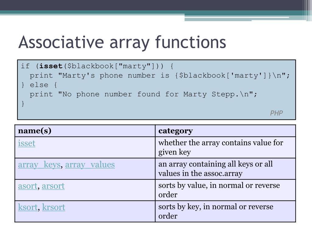 Associative array functions if (isset($blackbook["marty"])) { print "Marty's phone number is {$blackbook['marty']}\n"; } else { print "No phone number found for Marty Stepp.\n"; }PHP