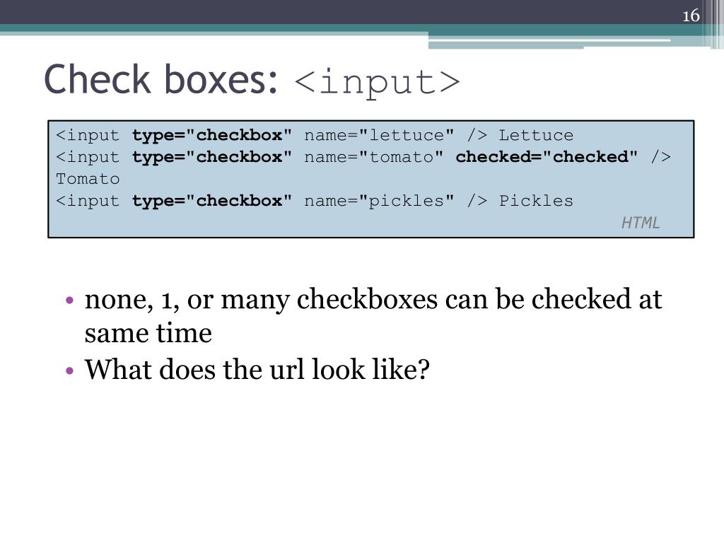 none, 1, or many checkboxes can be checked at same time What does the url look like? Check boxes: <input> <input type="checkbox" name="lettuce" /> Lettuce <input type="checkbox" name="tomato" checked="checked" /> Tomato <input type="checkbox" name="pickles" /> PicklesHTML