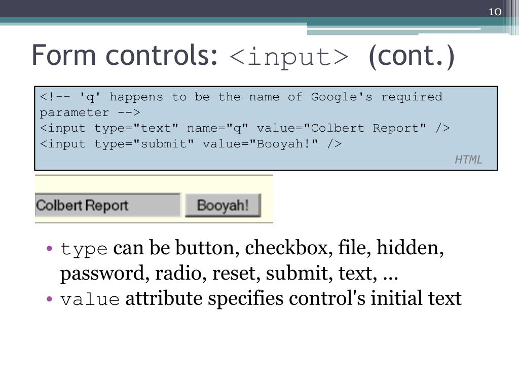 type can be button, checkbox, file, hidden, password, radio, reset, submit, text, ... value attribute specifies control's initial text Form controls: <input> (cont.) <!-- 'q' happens to be the name of Google's required parameter --> <input type="text" name="q" value="Colbert Report" /> <input type="submit" value="Booyah!" />HTML