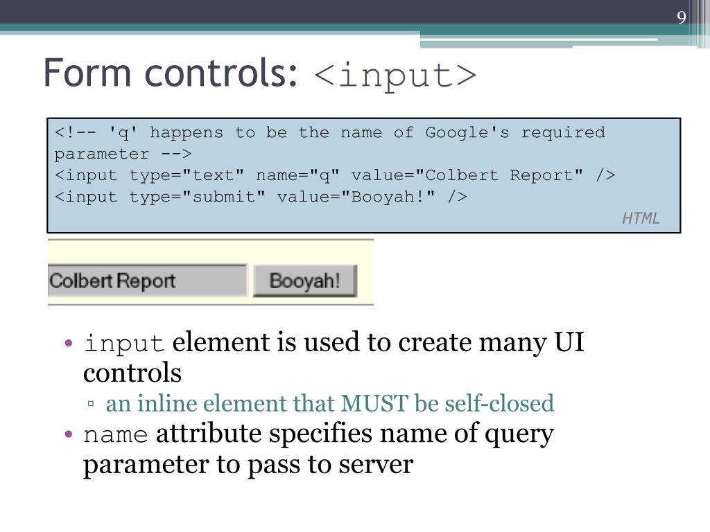 input element is used to create many UI controls • an inline element that MUST be self-closed • name attribute specifies name of query parameter to pass to server Form controls: <input> <!-- 'q' happens to be the name of Google's required parameter --> <input type="text" name="q" value="Colbert Report" /> <input type="submit" value="Booyah!" />HTML
