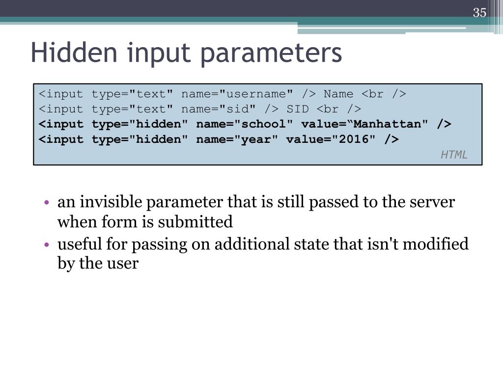 an invisible parameter that is still passed to the server when form is submitted useful for passing on additional state that isn't modified by the user Hidden input parameters <input type="text" name="username" /> Name <br /> <input type="text" name="sid" /> SID <br /> <input type="hidden" name="school" value=“Manhattan" /> <input type="hidden" name="year" value="2016" />HTML