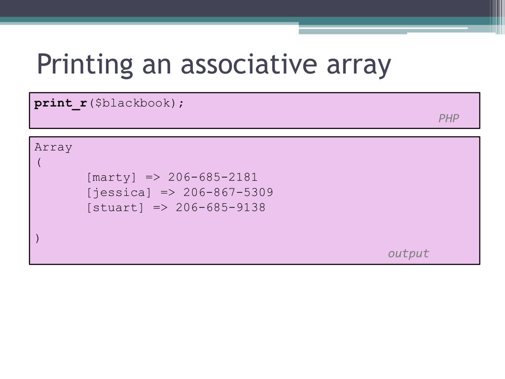 Printing an associative array print_r($blackbook); PHP Array ( [marty] => 206-685-2181 [jessica] => 206-867-5309 [stuart] => 206-685-9138 ) output