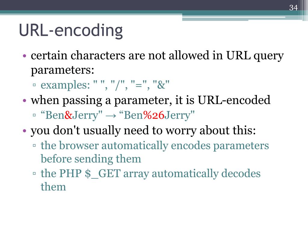 certain characters are not allowed in URL query parameters: • examples: " ", "/", "=", "&" • when passing a parameter, it is URL-encoded • “Ben&Jerry" → “Ben%26Jerry" • you don't usually need to worry about this: • the browser automatically encodes parameters before sending them • the PHP $_GET array automatically decodes them URL-encoding