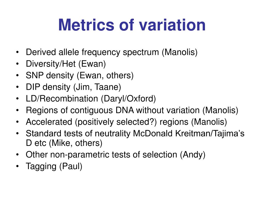 Metrics of variation • Derived allele frequency spectrum (Manolis) • Diversity/Het (Ewan) • SNP density (Ewan, others) • DIP density (Jim, Taane) • LD/Recombination (Daryl/Oxford) • Regions of contiguous DNA without variation (Manolis) • Accelerated (positively selected?) regions (Manolis) • Standard tests of neutrality McDonald Kreitman/Tajima’s D etc (Mike, others) • Other non-parametric tests of selection (Andy) • Tagging (Paul)