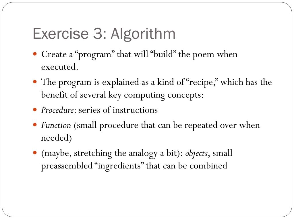 Exercise 3: Algorithm • Create a “program” that will “build” the poem when executed. • The program is explained as a kind of “recipe,” which has the benefit of several key computing concepts: • Procedure: series of instructions • Function (small procedure that can be repeated over when needed) • (maybe, stretching the analogy a bit): objects, small preassembled “ingredients” that can be combined