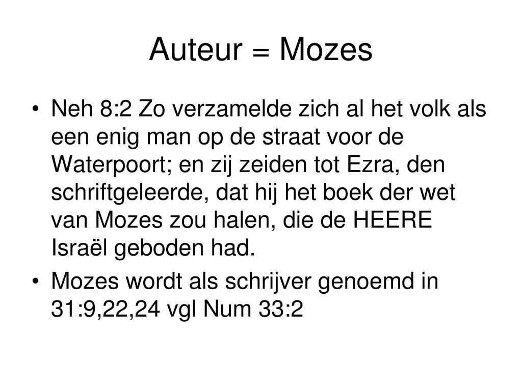 Auteur = Mozes • Neh 8:2 Zo verzamelde zich al het volk als een enig man op de straat voor de Waterpoort; en zij zeiden tot Ezra, den schriftgeleerde, dat hij het boek der wet van Mozes zou halen, die de HEERE Israël geboden had. • Mozes wordt als schrijver genoemd in 31:9,22,24 vgl Num 33:2