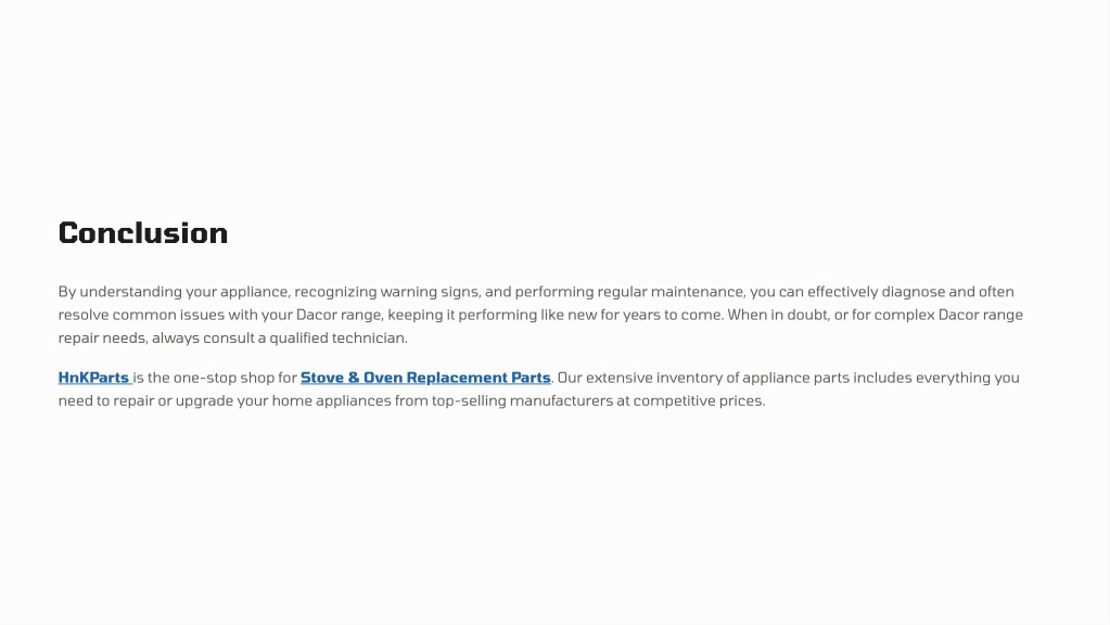 10. Conclusion By understanding your appliance, recognizing warning signs, and performing regular maintenance, you can effectively diagnose and often resolve common issues with your Dacor range, keeping it performing like new for years to come. When in doubt, or for complex Dacor range repair needs, always consult a qualified technician. HnKParts is the one-stop shop for Stove & Oven Replacement Parts. Our extensive inventory of appliance parts includes everything you need to repair or upgrade your home appliances from top-selling manufacturers at competitive prices.