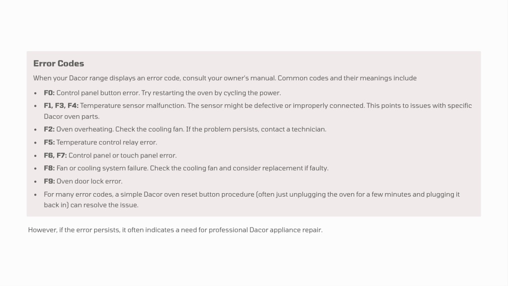 7. Error Codes When your Dacor range displays an error code, consult your owner's manual. Common codes and their meanings include F0: Control panel button error. Try restarting the oven by cycling the power. F1, F3, F4: Temperature sensor malfunction. The sensor might be defective or improperly connected. This points to issues with specific Dacor oven parts. F2: Oven overheating. Check the cooling fan. If the problem persists, contact a technician. F5: Temperature control relay error. F6, F7: Control panel or touch panel error. F8: Fan or cooling system failure. Check the cooling fan and consider replacement if faulty. F9: Oven door lock error. For many error codes, a simple Dacor oven reset button procedure (often just unplugging the oven for a few minutes and plugging it back in) can resolve the issue.  However, if the error persists, it often indicates a need for professional Dacor appliance repair.