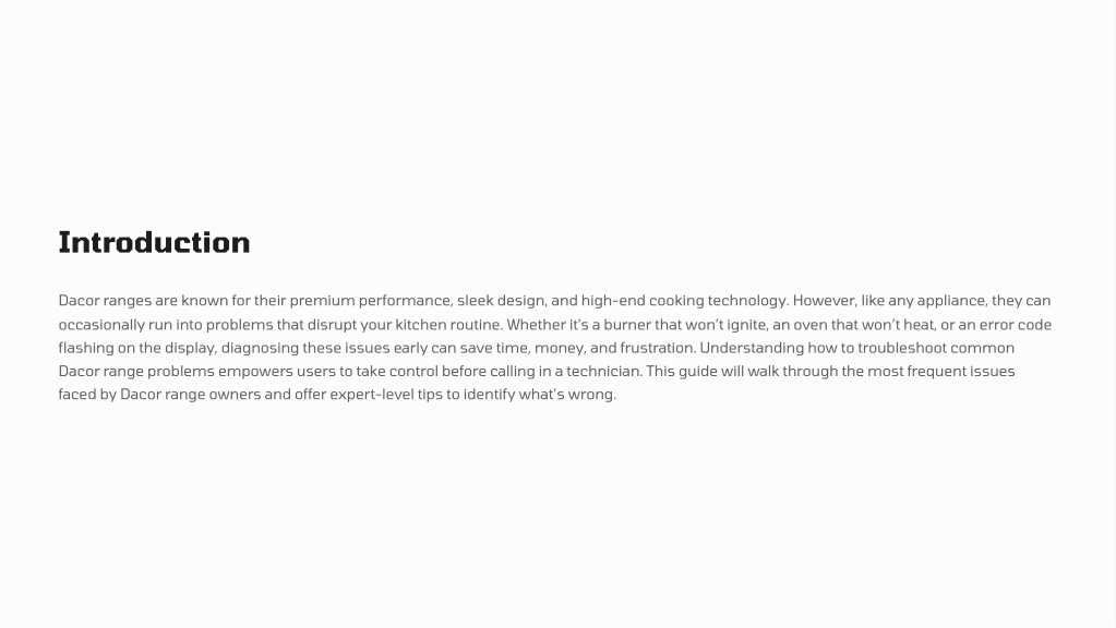 1. Introduction Dacor ranges are known for their premium performance, sleek design, and high-end cooking technology. However, like any appliance, they can occasionally run into problems that disrupt your kitchen routine. Whether it's a burner that won9t ignite, an oven that won9t heat, or an error code flashing on the display, diagnosing these issues early can save time, money, and frustration. Understanding how to troubleshoot common Dacor range problems empowers users to take control before calling in a technician. This guide will walk through the most frequent issues faced by Dacor range owners and offer expert-level tips to identify what9s wrong.