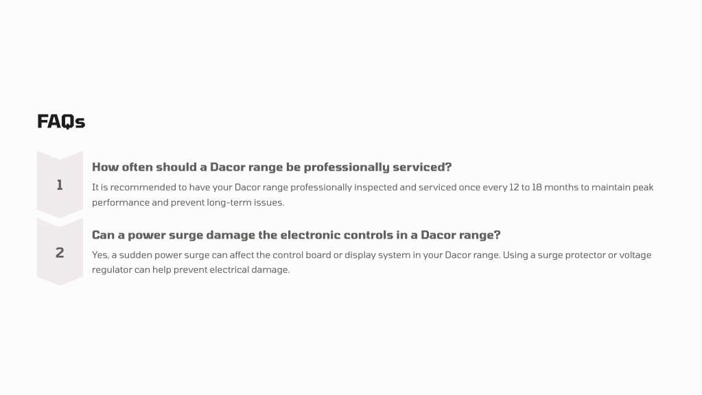 11. FAQs How often should a Dacor range be professionally serviced? 1 It is recommended to have your Dacor range professionally inspected and serviced once every 12 to 18 months to maintain peak performance and prevent long-term issues. Can a power surge damage the electronic controls in a Dacor range? 2 Yes, a sudden power surge can affect the control board or display system in your Dacor range. Using a surge protector or voltage regulator can help prevent electrical damage.