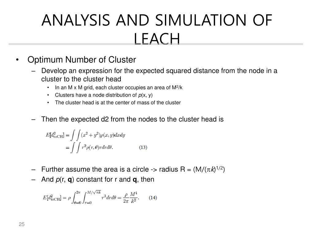ANALYSIS AND SIMULATION OF LEACH • Optimum Number of Cluster • Develop an expression for the expected squared distance from the node in a cluster to the cluster head • In an M x M grid, each cluster occupies an area of M2/k • Clusters have a node distribution of p(x, y) • The cluster head is at the center of mass of the cluster • Then the expected d2 from the nodes to the cluster head is • Further assume the area is a circle -> radius R = (M/(pk)1/2) • And p(r, q) constant for r and q, then
