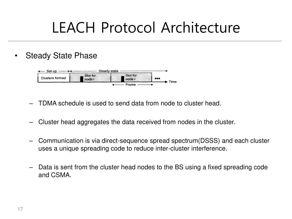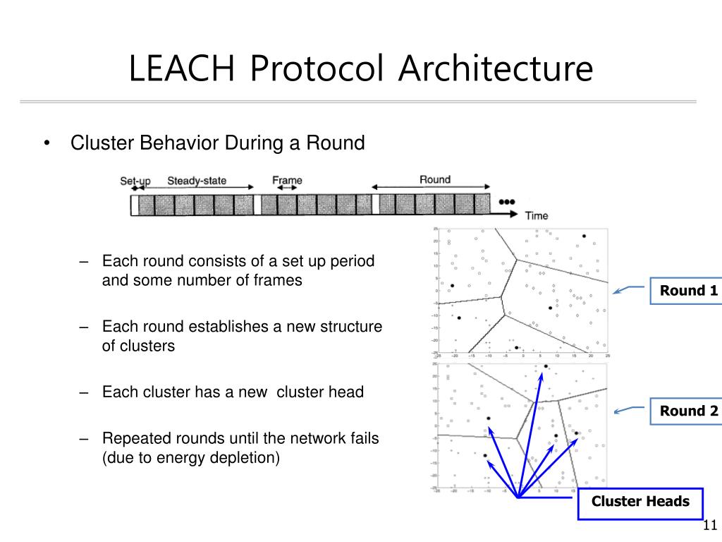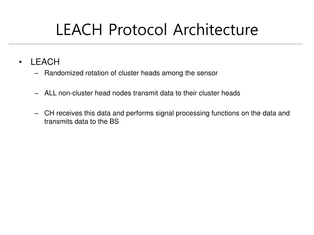 LEACH(Low-Energy Adaptive Clustering Hierarchy) • Randomized, adaptive, self-configuring cluster formation • Localized control of data transfers • Low energy media access control(MAC) • Application specific data processing, such as data aggregation and compression
