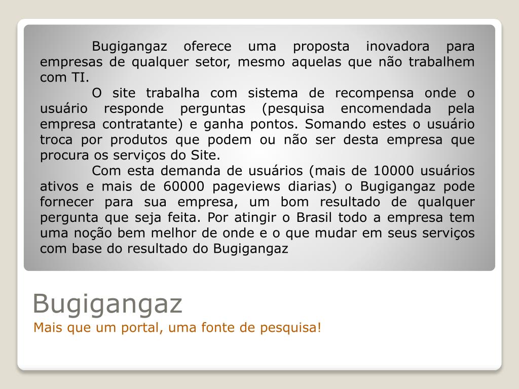 Bugigangaz oferece uma proposta inovadora para empresas de qualquer setor, mesmo aquelas que não trabalhem com TI. O site trabalha com sistema de recompensa onde o usuário responde perguntas (pesquisa encomendada pela empresa contratante) e ganha pontos. Somando estes o usuário troca por produtos que podem ou não ser desta empresa que procura os serviços do Site. Com esta demanda de usuários (mais de 10000 usuários ativos e mais de 60000 pageviews diarias) o Bugigangaz pode fornecer para sua empresa, um bom resultado de qualquer pergunta que seja feita. Por atingir o Brasil todo a empresa tem uma noção bem melhor de onde e o que mudar em seus serviços com base do resultado do Bugigangaz Bugigangaz Mais que um portal, uma fonte de pesquisa!