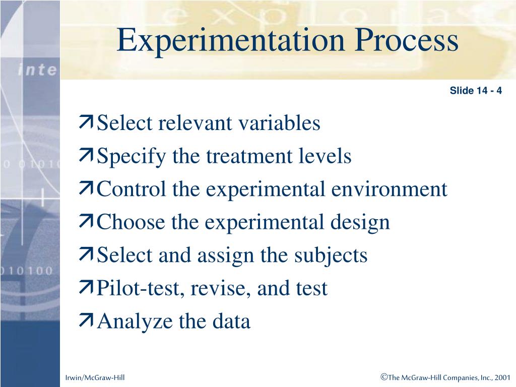 Experimentation Process Slide 14 - 4 • Select relevant variables • Specify the treatment levels • Control the experimental environment • Choose the experimental design • Select and assign the subjects • Pilot-test, revise, and test • Analyze the data