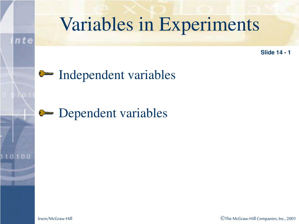 Variables in Experiments Slide 14 - 1 • Independent variables • Dependent variables
