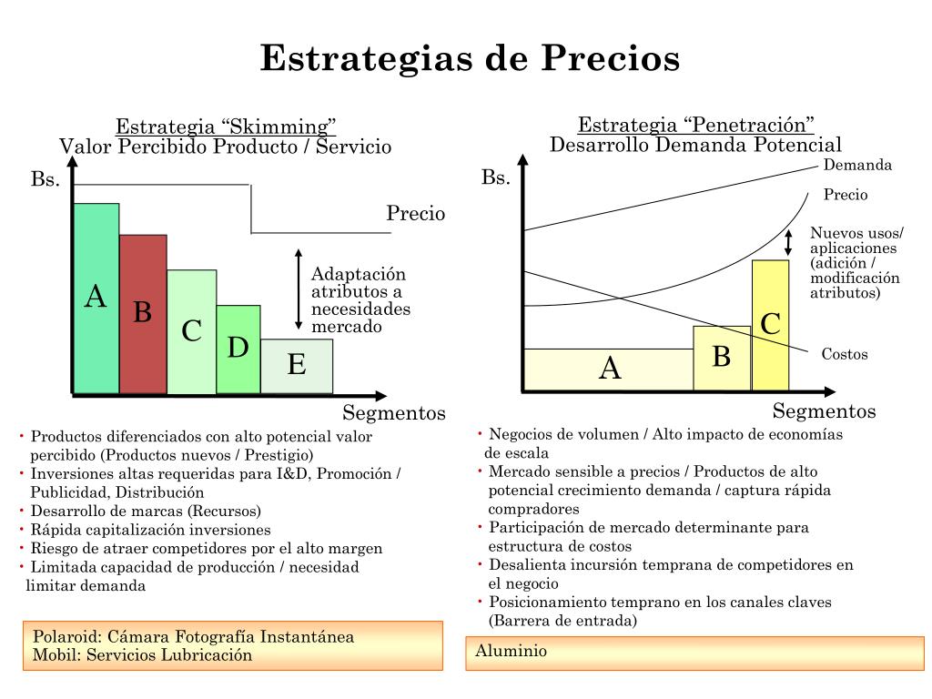 Estrategias de Precios Estrategia “Penetración” Desarrollo Demanda Potencial Estrategia “Skimming” Valor Percibido Producto / Servicio Demanda Precio Bs. Bs. Precio A Nuevos usos/ aplicaciones (adición / modificación atributos) B C Adaptación atributos a necesidades mercado C D B E Costos A Segmentos Segmentos • Negocios de volumen / Alto impacto de economías • de escala • Mercado sensible a precios / Productos de alto • potencial crecimiento demanda / captura rápida • compradores • Participación de mercado determinante para • estructura de costos • Desalienta incursión temprana de competidores en • el negocio • Posicionamiento temprano en los canales claves • (Barrera de entrada) • Productos diferenciados con alto potencial valor • percibido (Productos nuevos / Prestigio) • Inversiones altas requeridas para I&D, Promoción / • Publicidad, Distribución • Desarrollo de marcas (Recursos) • Rápida capitalización inversiones • Riesgo de atraer competidores por el alto margen • Limitada capacidad de producción / necesidad • limitar demanda Polaroid: Cámara Fotografía Instantánea Mobil: Servicios Lubricación Aluminio