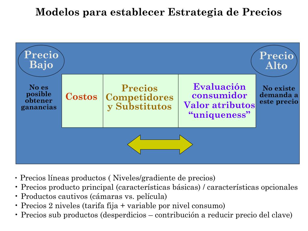 Modelos para establecer Estrategia de Precios Precio Bajo Precio Alto Evaluación consumidor Valor atributos “uniqueness” Precios Competidores y Substitutos No es posible obtener ganancias No existe demanda a este precio Costos • Precios líneas productos ( Niveles/gradiente de precios) • Precios producto principal (características básicas) / características opcionales • Productos cautivos (cámaras vs. película) • Precios 2 niveles (tarifa fija + variable por nivel consumo) • Precios sub productos (desperdicios – contribución a reducir precio del clave)