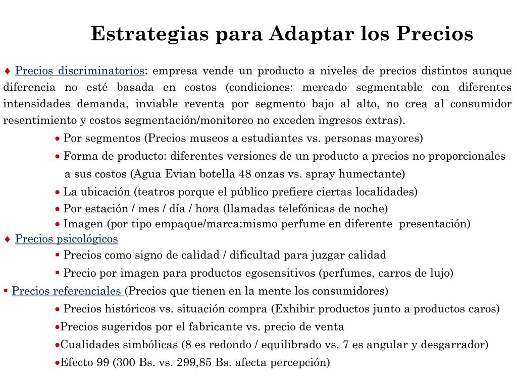 Estrategias para Adaptar los Precios • Precios discriminatorios: empresa vende un producto a niveles de precios distintos aunque diferencia no esté basada en costos (condiciones: mercado segmentable con diferentes intensidades demanda, inviable reventa por segmento bajo al alto, no crea al consumidor resentimiento y costos segmentación/monitoreo no exceden ingresos extras). • Por segmentos (Precios museos a estudiantes vs. personas mayores) • Forma de producto: diferentes versiones de un producto a precios no proporcionales a sus costos (Agua Evian botella 48 onzas vs. spray humectante) • La ubicación (teatros porque el público prefiere ciertas localidades) • Por estación / mes / día / hora (llamadas telefónicas de noche) • Imagen (por tipo empaque/marca:mismo perfume en diferente presentación) • Precios psicológicos • Precios como signo de calidad / dificultad para juzgar calidad • Precio por imagen para productos egosensitivos (perfumes, carros de lujo) • Precios referenciales (Precios que tienen en la mente los consumidores) • Precios históricos vs. situación compra (Exhibir productos junto a productos caros) • Precios sugeridos por el fabricante vs. precio de venta • Cualidades simbólicas (8 es redondo / equilibrado vs. 7 es angular y desgarrador) • Efecto 99 (300 Bs. vs. 299,85 Bs. afecta percepción)