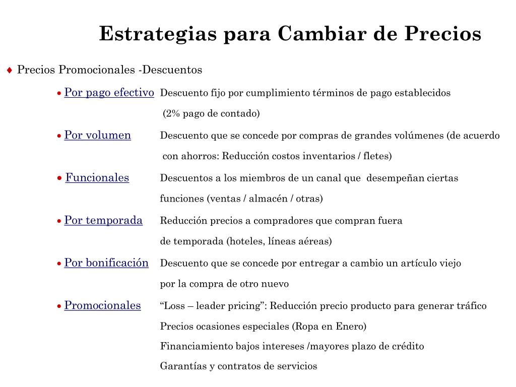 Estrategias para Cambiar de Precios • Precios Promocionales -Descuentos • Por pago efectivo Descuento fijo por cumplimiento términos de pago establecidos (2% pago de contado) • Por volumen Descuento que se concede por compras de grandes volúmenes (de acuerdo con ahorros: Reducción costos inventarios / fletes) • Funcionales Descuentos a los miembros de un canal que desempeñan ciertas funciones (ventas / almacén / otras) • Por temporadaReducción precios a compradores que compran fuera de temporada (hoteles, líneas aéreas) • Por bonificación Descuento que se concede por entregar a cambio un artículo viejo por la compra de otro nuevo • Promocionales “Loss – leader pricing”: Reducción precio producto para generar tráfico Precios ocasiones especiales (Ropa en Enero) Financiamiento bajos intereses /mayores plazo de crédito Garantías y contratos de servicios