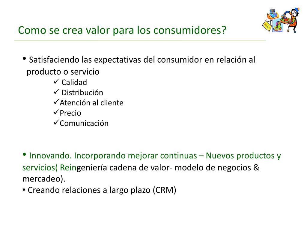 Como se crea valor para los consumidores? • Satisfaciendo las expectativas del consumidor en relación al • producto o servicio • Calidad • Distribución • Atención al cliente • Precio • Comunicación • Innovando. Incorporando mejorar continuas – Nuevos productos y servicios( Reingeniería cadena de valor- modelo de negocios & mercadeo). • Creando relaciones a largo plazo (CRM)