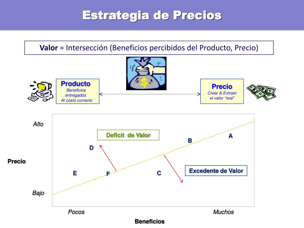 Estrategia de Precios Valor = Intersección (Beneficios percibidos del Producto, Precio) Producto Beneficios entregados Al costo correcto Precio Crear & Extraer el valor “real” Alto Deficit de Valor A B D Precio Excedente de Valor E C F Bajo Pocos Muchos Beneficios