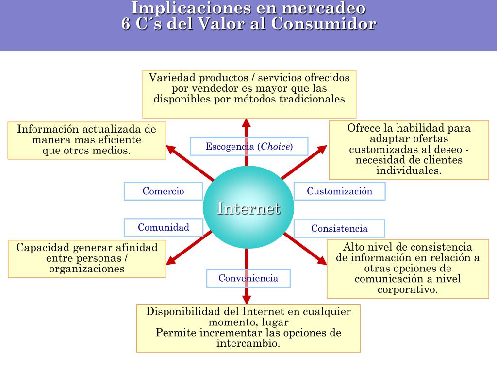 Implicaciones en mercadeo 6 C´s del Valor al Consumidor Variedad productos / servicios ofrecidos por vendedor es mayor que las disponibles por métodos tradicionales Ofrece la habilidad para adaptar ofertas customizadas al deseo - necesidad de clientes individuales. Información actualizada de manera mas eficiente que otros medios. Escogencia (Choice) Internet Comercio Customización Comunidad Consistencia Alto nivel de consistencia de información en relación a otras opciones de comunicación a nivel corporativo. Capacidad generar afinidad entre personas / organizaciones Conveniencia Disponibilidad del Internet en cualquier momento, lugar Permite incrementar las opciones de intercambio.