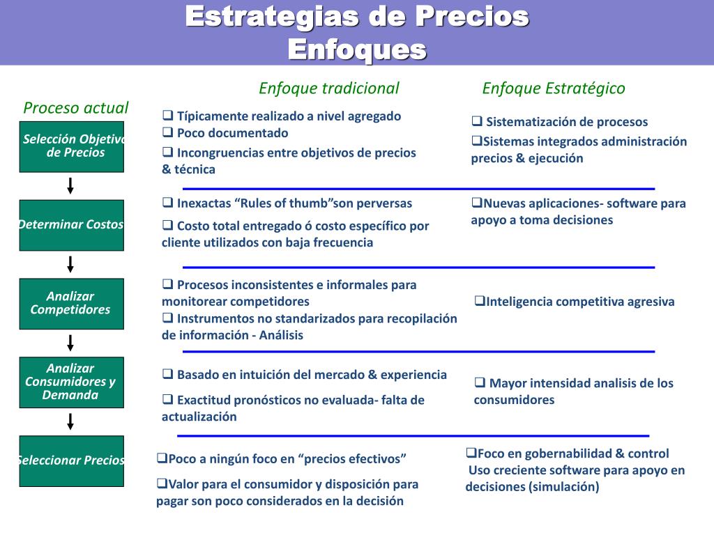 Estrategias de Precios Enfoques Enfoque tradicional Enfoque Estratégico Proceso actual • Típicamente realizado a nivel agregado • Sistematización de procesos • Poco documentado Selección Objetivo de Precios • Sistemas integrados administración precios & ejecución • Incongruencias entre objetivos de precios & técnica • Inexactas “Rules of thumb”son perversas • Nuevas aplicaciones- software para apoyo a toma decisiones Determinar Costos • Costo total entregado ó costo específico por cliente utilizados con baja frecuencia • Procesos inconsistentes e informales para monitorear competidores Analizar Competidores • Inteligencia competitiva agresiva • Instrumentos no standarizados para recopilación de información - Análisis • Basado en intuición del mercado & experiencia Analizar Consumidores y Demanda • Mayor intensidad analisis de los consumidores • Exactitud pronósticos no evaluada- falta de actualización Seleccionar Precios • Poco a ningún foco en “precios efectivos” • Foco en gobernabilidad & control Uso creciente software para apoyo en decisiones (simulación) • Valor para el consumidor y disposición para pagar son poco considerados en la decisión
