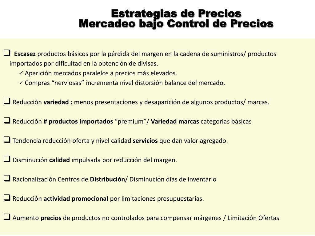Estrategias de Precios Mercadeo bajo Control de Precios • Escasez productos básicos por la pérdida del margen en la cadena de suministros/ productos importados por dificultad en la obtención de divisas. • Aparición mercados paralelos a precios más elevados. • Compras “nerviosas” incrementa nivel distorsión balance del mercado. • Reducción variedad : menos presentaciones y desaparición de algunos productos/ marcas. • Reducción # productos importados “premium”/ Variedad marcas categorias básicas • Tendencia reducción oferta y nivel calidad servicios que dan valor agregado. • Disminución calidad impulsadapor reducción del margen. • Racionalización Centros de Distribución/ Disminución días de inventario • Reducción actividad promocional por limitaciones presupuestarias. • Aumento precios de productos no controlados para compensar márgenes / Limitación Ofertas