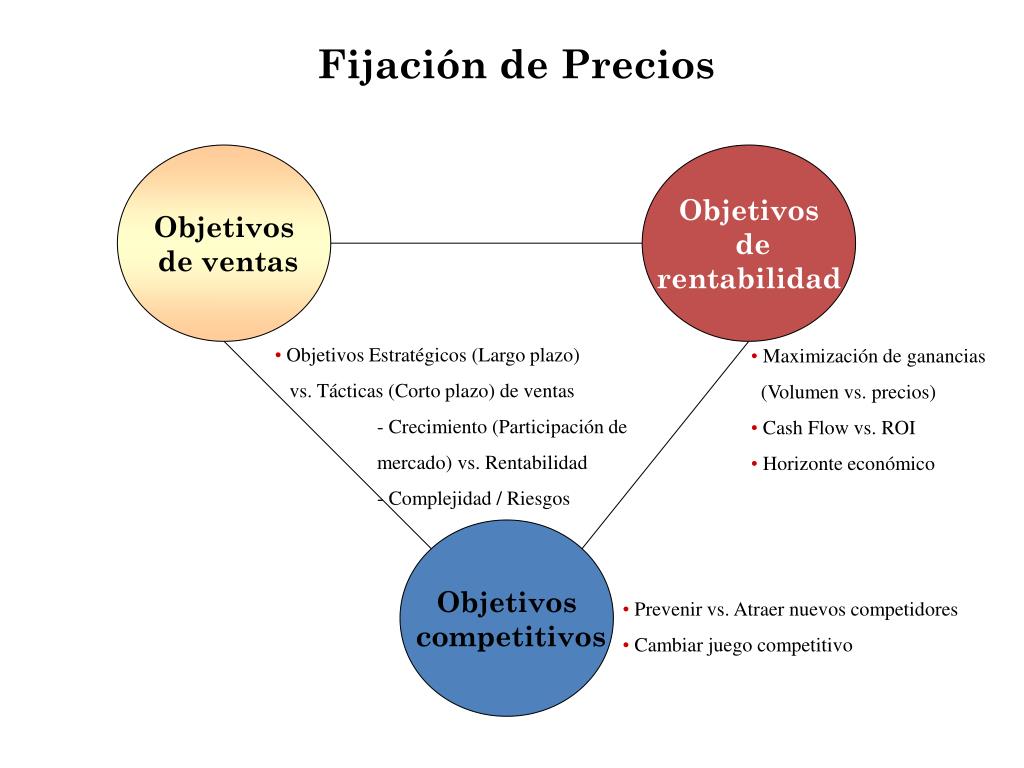 Fijación de Precios Objetivos de ventas Objetivos de rentabilidad • Objetivos Estratégicos (Largo plazo) • vs. Tácticas (Corto plazo) de ventas • - Crecimiento (Participación de • mercado) vs. Rentabilidad • - Complejidad / Riesgos • Maximización de ganancias • (Volumen vs. precios) • Cash Flow vs. ROI • Horizonte económico Objetivos competitivos • Prevenir vs. Atraer nuevos competidores • Cambiar juego competitivo