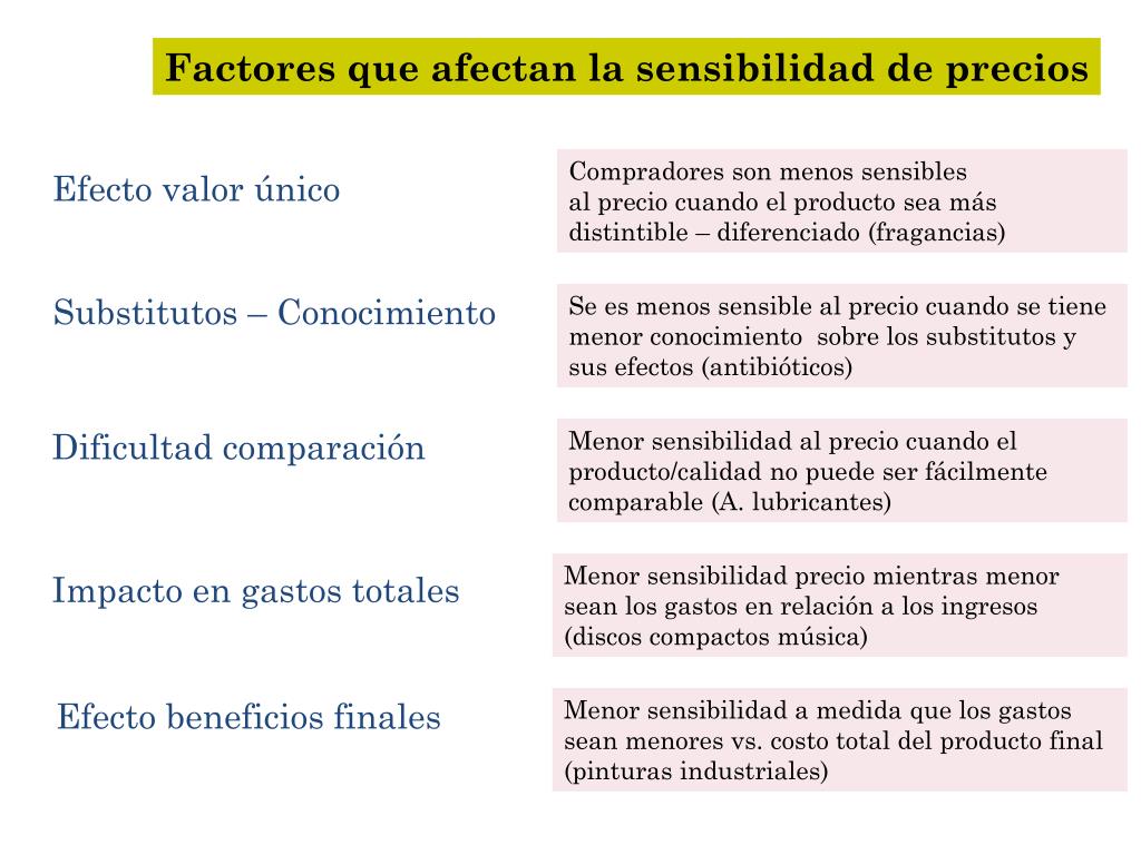 Factores que afectan la sensibilidad de precios Compradores son menos sensibles al precio cuando el producto sea más distintible – diferenciado (fragancias) Efecto valor único Se es menos sensible al precio cuando se tiene menor conocimiento sobre los substitutos y sus efectos (antibióticos) Substitutos – Conocimiento Menor sensibilidad al precio cuando el producto/calidad no puede ser fácilmente comparable (A. lubricantes) Dificultad comparación Menor sensibilidad precio mientras menor sean los gastos en relación a los ingresos (discos compactos música) Impacto en gastos totales Menor sensibilidad a medida que los gastos sean menores vs. costo total del producto final (pinturas industriales) Efecto beneficios finales