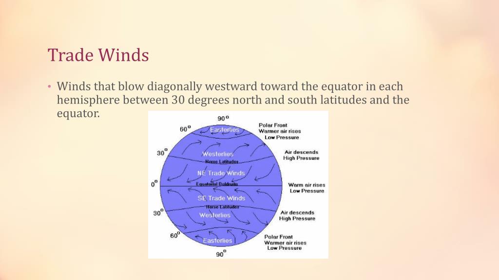 Trade Winds • Winds that blow diagonally westward toward the equator in each hemisphere between 30 degrees north and south latitudes and the equator.