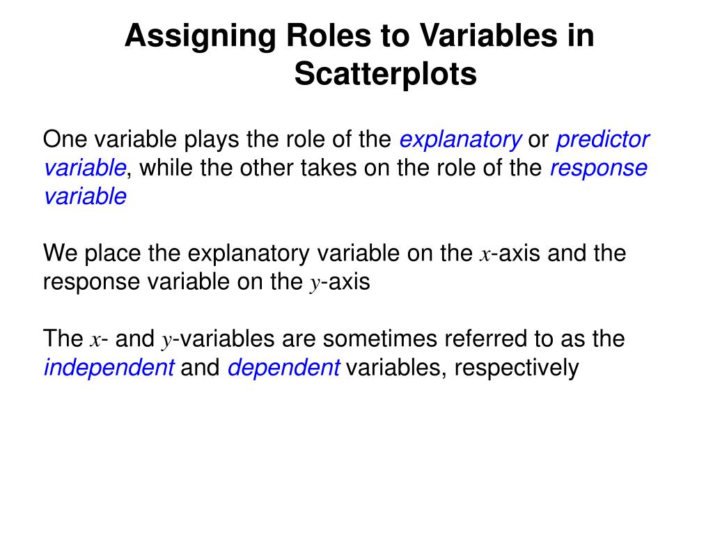 Assigning Roles to Variables in Scatterplots One variable plays the role of the explanatoryor predictor variable, while the other takes on the role of the response variable We place the explanatory variable on the x-axis and the response variable on the y-axis The x- and y-variables are sometimes referred to as the independentand dependentvariables, respectively