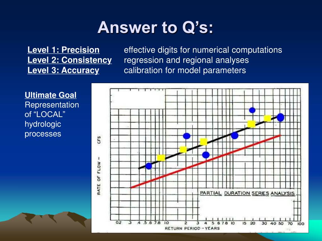 Answer to Q’s: Level 1: Precision effective digits for numerical computations Level 2: Consistency regression and regional analyses Level 3: Accuracycalibration for model parameters Ultimate Goal Representation of “LOCAL” hydrologic processes