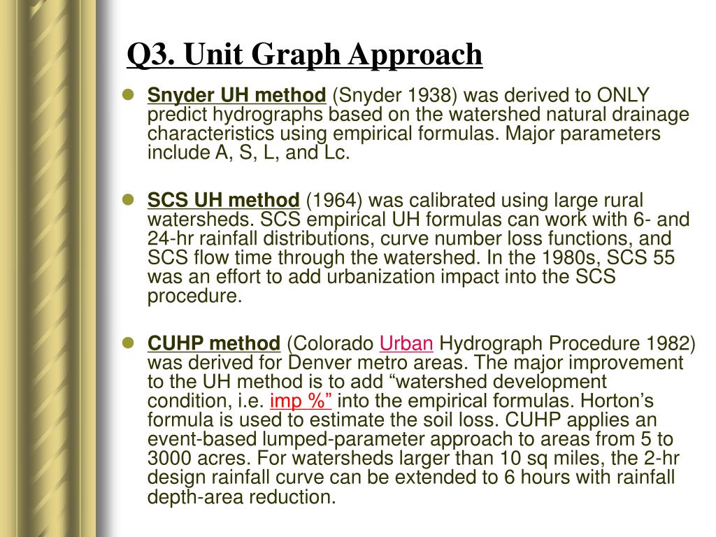 Q3. Unit Graph Approach • Snyder UH method (Snyder 1938) was derived to ONLY predict hydrographs based on the watershed natural drainage characteristics using empirical formulas. Major parameters include A, S, L, and Lc. • SCS UH method (1964) was calibrated using large rural watersheds. SCS empirical UH formulas can work with 6- and 24-hr rainfall distributions, curve number loss functions, and SCS flow time through the watershed. In the 1980s, SCS 55 was an effort to add urbanization impact into the SCS procedure. • CUHP method (Colorado Urban Hydrograph Procedure 1982) was derived for Denver metro areas. The major improvement to the UH method is to add “watershed development condition, i.e. imp %” into the empirical formulas. Horton’s formula is used to estimate the soil loss. CUHP applies an event-based lumped-parameter approach to areas from 5 to 3000 acres. For watersheds larger than 10 sq miles, the 2-hr design rainfall curve can be extended to 6 hours with rainfall depth-area reduction.