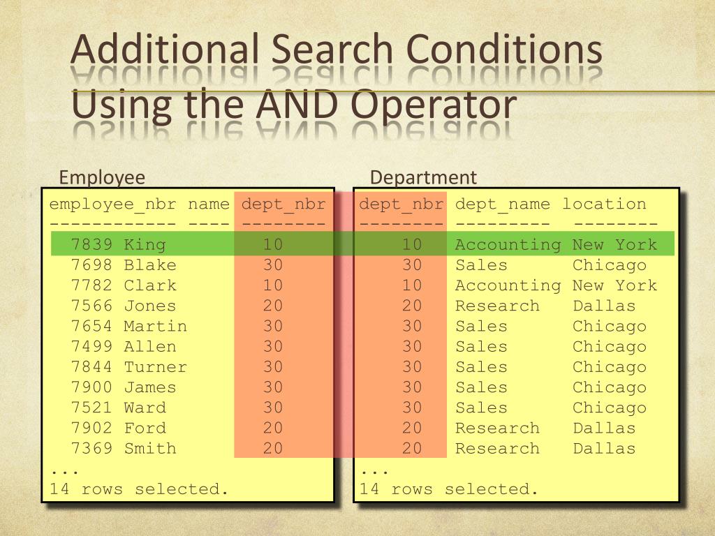 Additional Search ConditionsUsing the AND Operator Employee Department employee_nbr name dept_nbr ------------ ---- -------- 7839 King 10 7698 Blake 30 7782 Clark 10 7566 Jones 20 7654 Martin 30 7499 Allen 30 7844 Turner 30 7900 James 30 7521 Ward 30 7902 Ford 20 7369 Smith 20 ... 14 rows selected. dept_nbrdept_name location -------- --------- -------- 10 Accounting New York 30 SalesChicago 10 Accounting New York 20 Research Dallas 30 SalesChicago 30 SalesChicago 30 SalesChicago 30 SalesChicago 30 SalesChicago 20 Research Dallas 20 Research Dallas ... 14 rows selected.