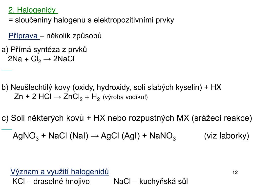2. Halogenidy = sloučeniny halogenů s elektropozitivními prvky Příprava – několik způsobů a) Přímá syntéza z prvků 2Na + Cl2 → 2NaCl b) Neušlechtilý kovy (oxidy, hydroxidy, soli slabých kyselin) + HX Zn + 2 HCl → ZnCl2 + H2 (výroba vodíku!) c) Soli některých kovů + HX nebo rozpustných MX (srážecí reakce) AgNO3 + NaCl (NaI) → AgCl (AgI) + NaNO3 (viz laborky) Význam a využití halogenidů KCl – draselné hnojivo NaCl – kuchyňská sůl