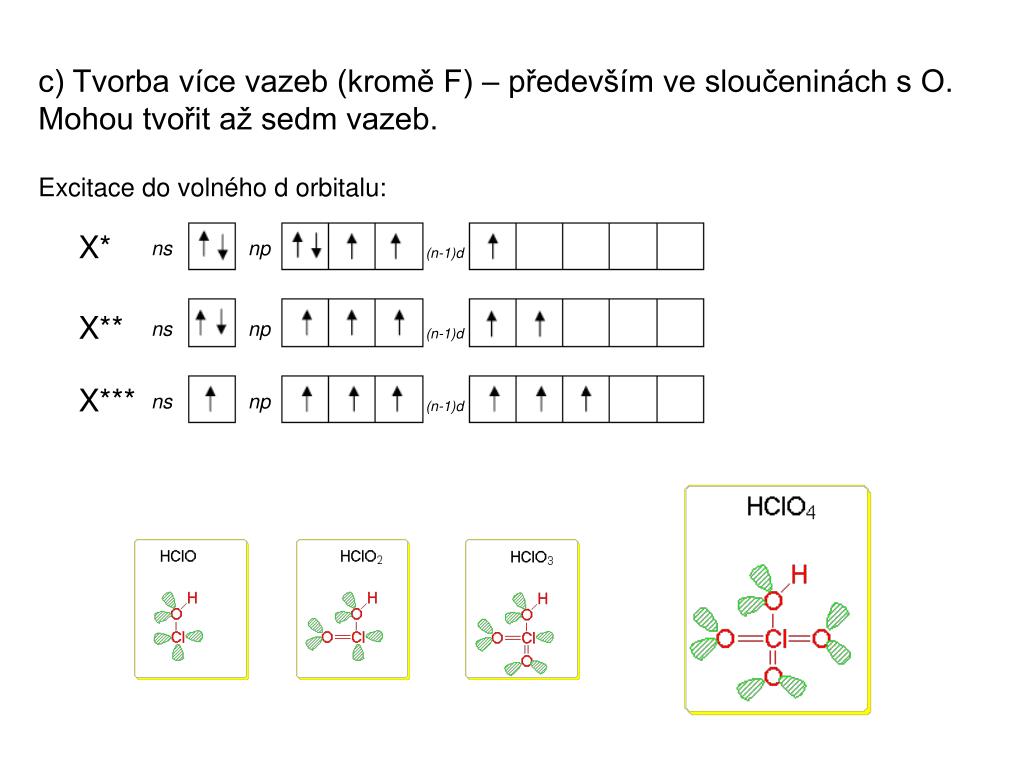 c) Tvorba více vazeb (kromě F) – především ve sloučeninách s O. Mohou tvořit až sedm vazeb. Excitace do volného d orbitalu: X* ns np (n-1)d X** ns np (n-1)d X*** ns np (n-1)d