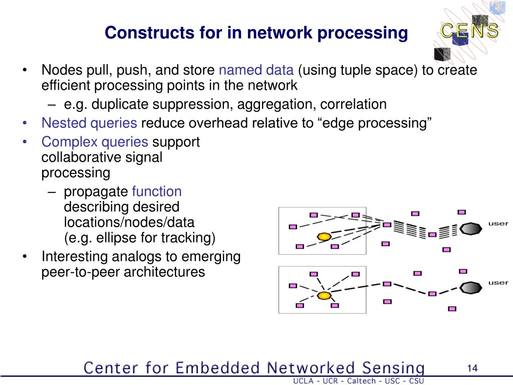 Constructs for in network processing • Nodes pull, push, and store named data (using tuple space) to create efficient processing points in the network • e.g. duplicate suppression, aggregation, correlation • Nested queries reduce overhead relative to “edge processing” • Complex queries support collaborative signal processing • propagate function describing desired locations/nodes/data (e.g. ellipse for tracking) • Interesting analogs to emergingpeer-to-peer architectures