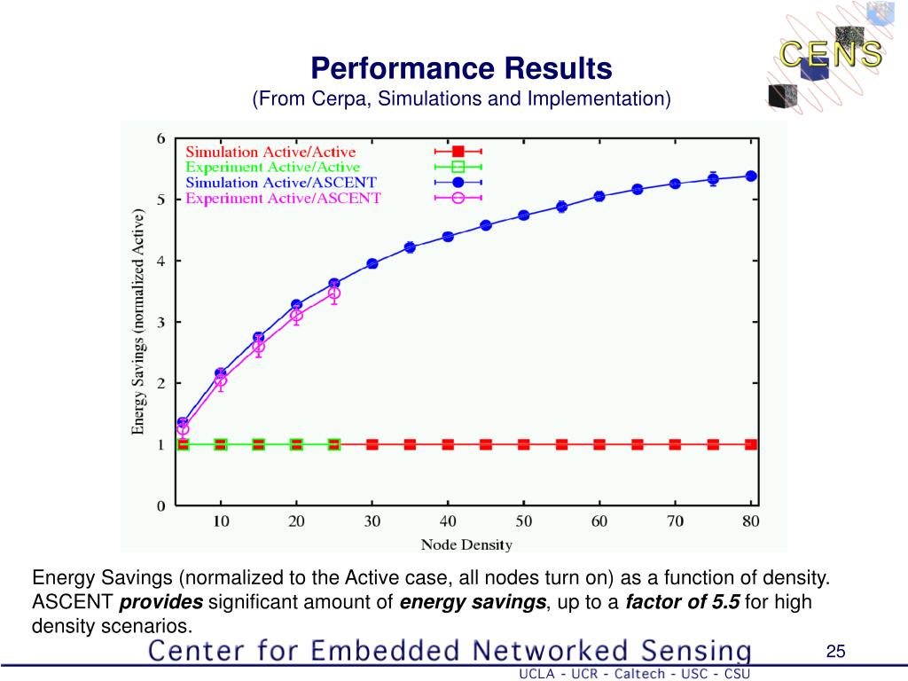 Performance Results(From Cerpa, Simulations and Implementation) Energy Savings (normalized to the Active case, all nodes turn on) as a function of density. ASCENT provides significant amount of energy savings, up to a factor of 5.5 for high density scenarios.