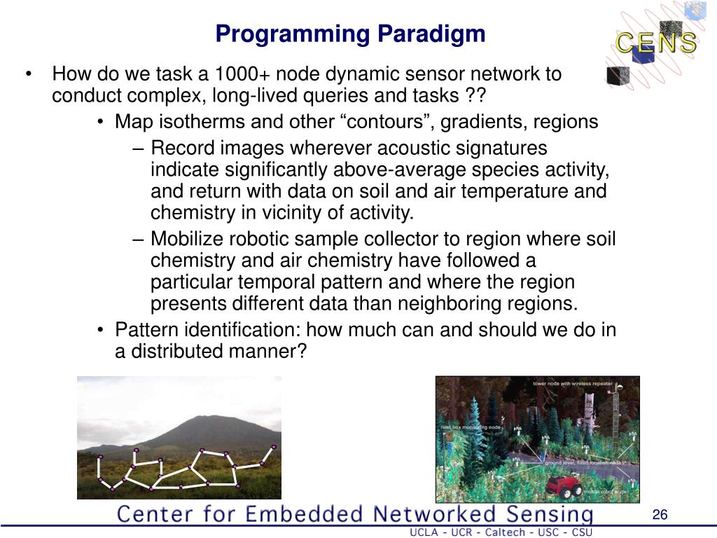 Programming Paradigm • How do we task a 1000+ node dynamic sensor network to conduct complex, long-lived queries and tasks ?? • Map isotherms and other “contours”, gradients, regions • Record images wherever acoustic signatures indicate significantly above-average species activity, and return with data on soil and air temperature and chemistry in vicinity of activity. • Mobilize robotic sample collector to region where soil chemistry and air chemistry have followed a particular temporal pattern and where the region presents different data than neighboring regions. • Pattern identification: how much can and should we do in a distributed manner?