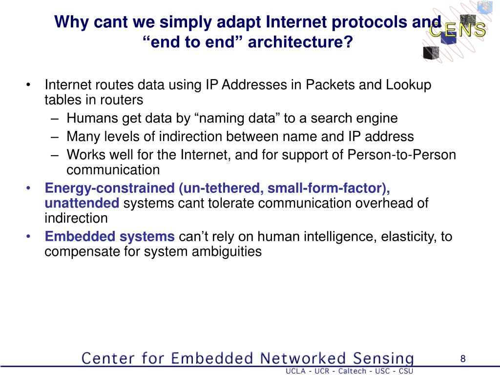 Why cant we simply adapt Internet protocols and “end to end” architecture? • Internet routes data using IP Addresses in Packets and Lookup tables in routers • Humans get data by “naming data” to a search engine • Many levels of indirection between name and IP address • Works well for the Internet, and for support of Person-to-Person communication • Energy-constrained (un-tethered, small-form-factor), unattended systems cant tolerate communication overhead of indirection • Embedded systems can’t rely on human intelligence, elasticity, to compensate for system ambiguities