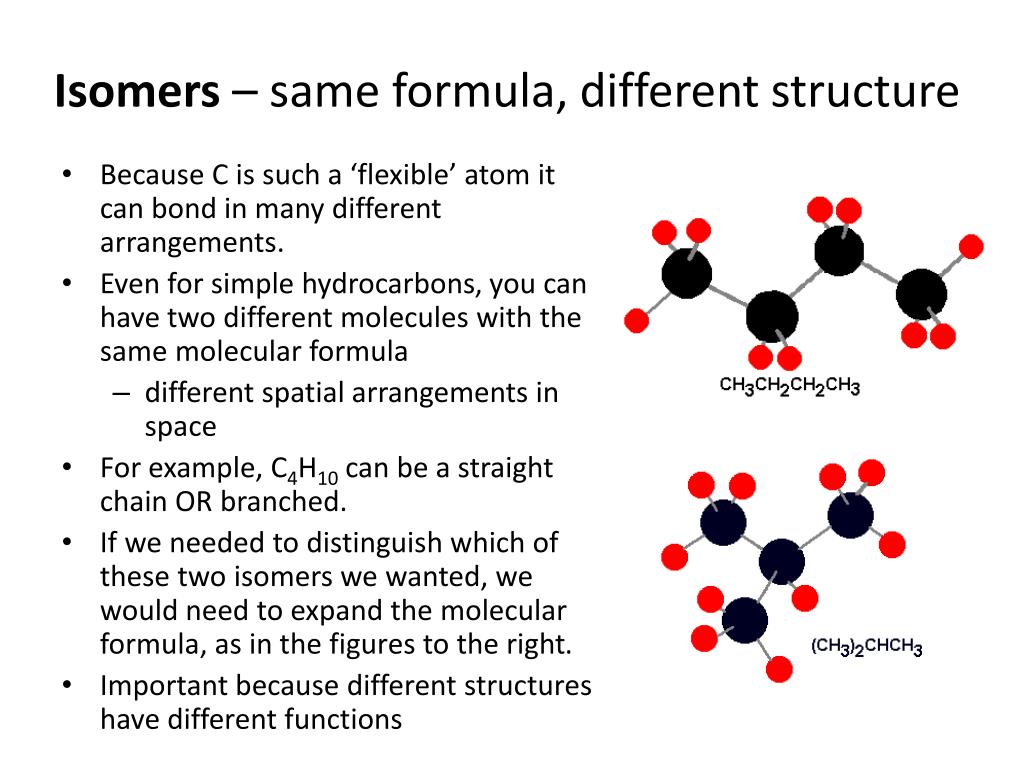 Isomers – same formula, different structure • Because C is such a ‘flexible’ atom it can bond in many different arrangements. • Even for simple hydrocarbons, you can have two different molecules with the same molecular formula • different spatial arrangements in space • For example, C4H10 can be a straight chain OR branched. • If we needed to distinguish which of these two isomers we wanted, we would need to expand the molecular formula, as in the figures to the right. • Important because different structures have different functions