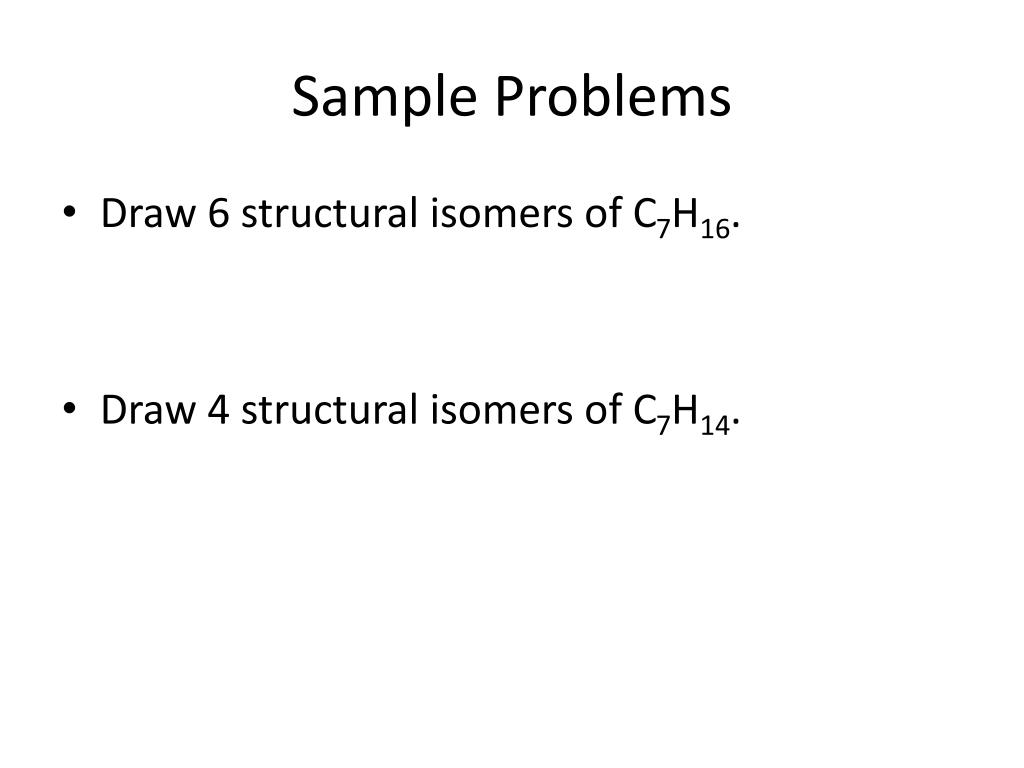 Sample Problems • Draw 6 structural isomers of C7H16. • Draw 4 structural isomers of C7H14.