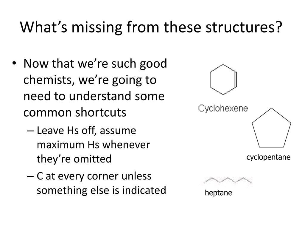 What’s missing from these structures? • Now that we’re such good chemists, we’re going to need to understand some common shortcuts • Leave Hs off, assume maximum Hs whenever they’re omitted • C at every corner unless something else is indicated cyclopentane heptane