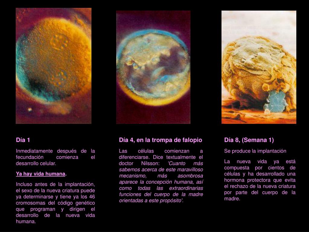 Día 1 Inmediatamente después de la fecundación comienza el desarrollo celular. Ya hay vida humana. Incluso antes de la implantación, el sexo de la nueva criatura puede ya determinarse y tiene ya los 46 cromosomas del código genético que programan y dirigen el desarrollo de la nueva vida humana. Día 4, en la trompa de falopio Las células comienzan a diferenciarse. Dice textualmente el doctor Nilsson: 'Cuanto más sabemos acerca de este maravilloso mecanismo, más asombrosa aparece la concepción humana, así como todas las extraordinarias funciones del cuerpo de la madre orientadas a este propósito'. Día 8, (Semana 1) Se produce la implantación La nueva vida ya está compuesta por cientos de células y ha desarrollado una hormona protectora que evita el rechazo de la nueva criatura por parte del cuerpo de la madre.
