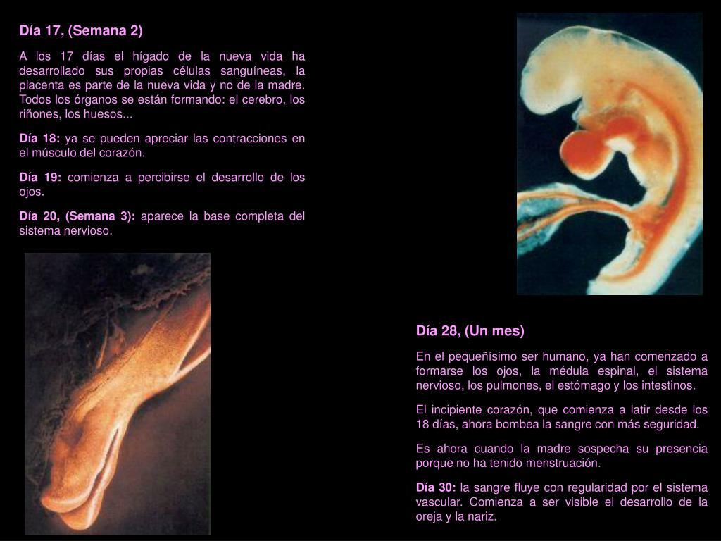 Día 17, (Semana 2) A los 17 días el hígado de la nueva vida ha desarrollado sus propias células sanguíneas, la placenta es parte de la nueva vida y no de la madre. Todos los órganos se están formando: el cerebro, los riñones, los huesos... Día 18: ya se pueden apreciar las contracciones en el músculo del corazón. Día 19: comienza a percibirse el desarrollo de los ojos. Día 20, (Semana 3): aparece la base completa del sistema nervioso. Día 28, (Un mes) En el pequeñísimo ser humano, ya han comenzado a formarse los ojos, la médula espinal, el sistema nervioso, los pulmones, el estómago y los intestinos. El incipiente corazón, que comienza a latir desde los 18 días, ahora bombea la sangre con más seguridad. Es ahora cuando la madre sospecha su presencia porque no ha tenido menstruación. Día 30: la sangre fluye con regularidad por el sistema vascular. Comienza a ser visible el desarrollo de la oreja y la nariz.