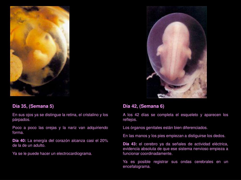 Día 35, (Semana 5) En sus ojos ya se distingue la retina, el cristalino y los párpados. Poco a poco las orejas y la nariz van adquiriendo forma. Día 40: La energía del corazón alcanza casi el 20% de la de un adulto. Ya se le puede hacer un electrocardiograma. Día 42, (Semana 6) A los 42 días se completa el esqueleto y aparecen los reflejos. Los órganos genitales están bien diferenciados. En las manos y los pies empiezan a distiguirse los dedos. Día 43: el cerebro ya da señales de actividad eléctrica, evidencia absoluta de que ese sistema nervioso empieza a funcionar coordinadamente. Ya es posible registrar sus ondas cerebrales en un encefalograma.