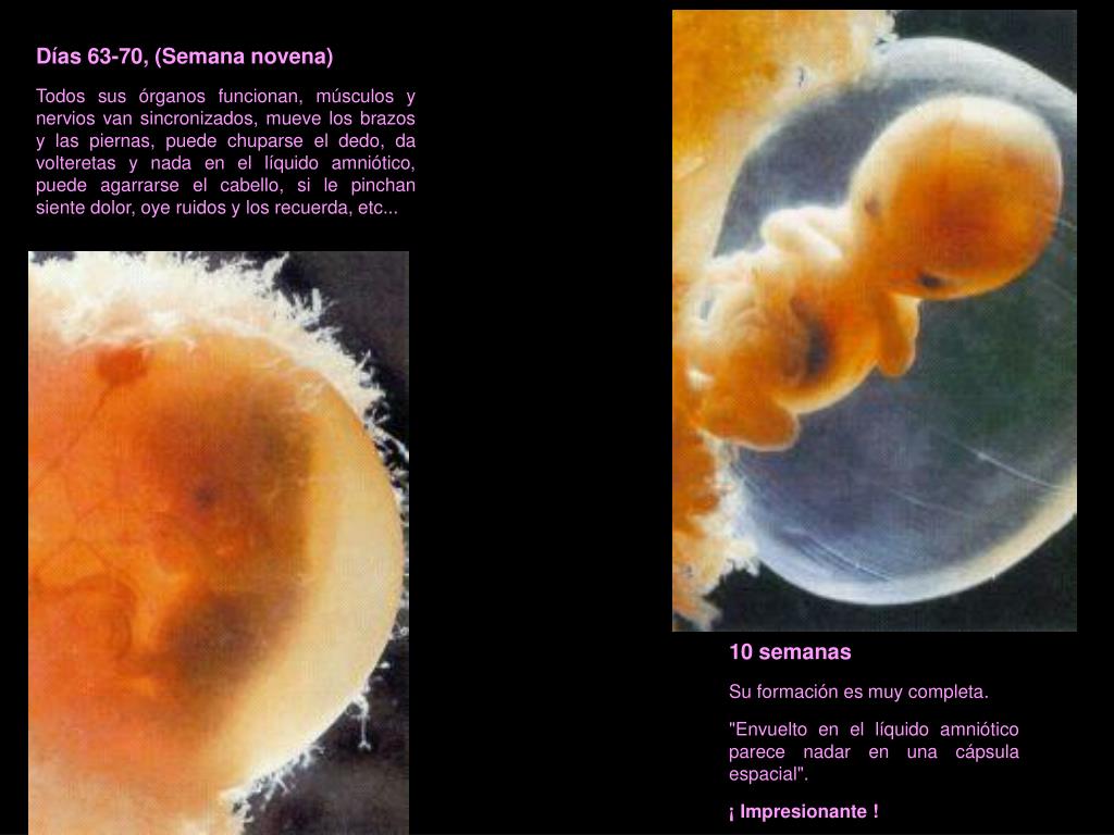 Días 63-70, (Semana novena) Todos sus órganos funcionan, músculos y nervios van sincronizados, mueve los brazos y las piernas, puede chuparse el dedo, da volteretas y nada en el líquido amniótico, puede agarrarse el cabello, si le pinchan siente dolor, oye ruidos y los recuerda, etc... 10 semanas Su formación es muy completa. "Envuelto en el líquido amniótico parece nadar en una cápsula espacial". ¡ Impresionante !