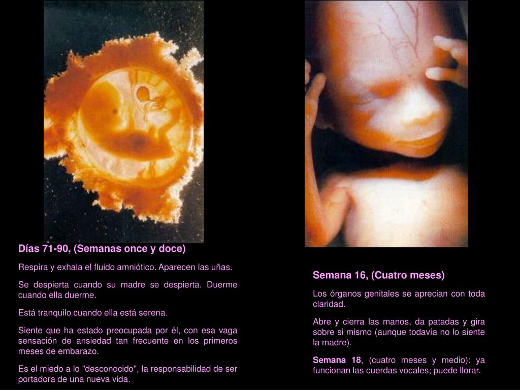Días 71-90, (Semanas once y doce) Respira y exhala el fluido amniótico. Aparecen las uñas. Se despierta cuando su madre se despierta. Duerme cuando ella duerme. Está tranquilo cuando ella está serena. Siente que ha estado preocupada por él, con esa vaga sensación de ansiedad tan frecuente en los primeros meses de embarazo. Es el miedo a lo "desconocido", la responsabilidad de ser portadora de una nueva vida. Semana 16, (Cuatro meses) Los órganos genitales se aprecian con toda claridad. Abre y cierra las manos, da patadas y gira sobre si mismo (aunque todavía no lo siente la madre). Semana 18, (cuatro meses y medio): ya funcionan las cuerdas vocales; puede llorar.